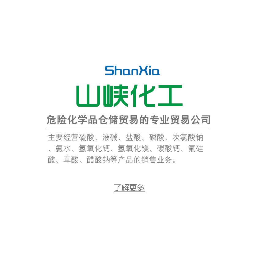 安慶市山峽化工有限公司成立于2013年1月,主營化工產品98%濃硫酸、精制酸(蓄電池酸)、稀硫酸定制、32%液堿、片堿、純堿、氫氧化鉀、氫氟酸、氫氧化鈉、鹽酸、磷酸、次氯酸鈉、氯化鈣、氨水、氫氧化鈣、氫氧化鎂、碳酸鈣、氟硅酸、草酸、醋酸鈉等化工產品。